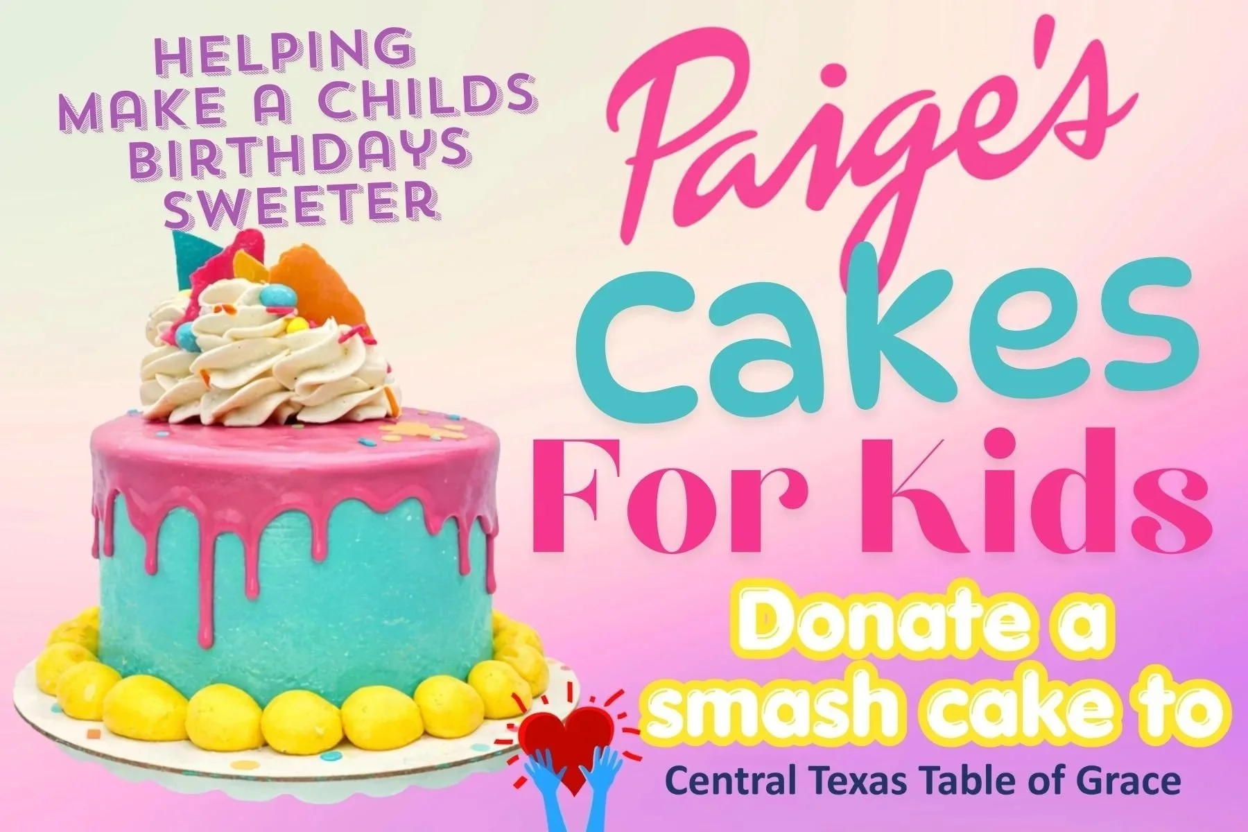 Paige’s Cakes for Kids is our new give‑back initiative supporting children in foster care through Central Texas Table of Grace. Every child deserves a birthday cake that makes them feel celebrated — and we’re committed to making that happen.